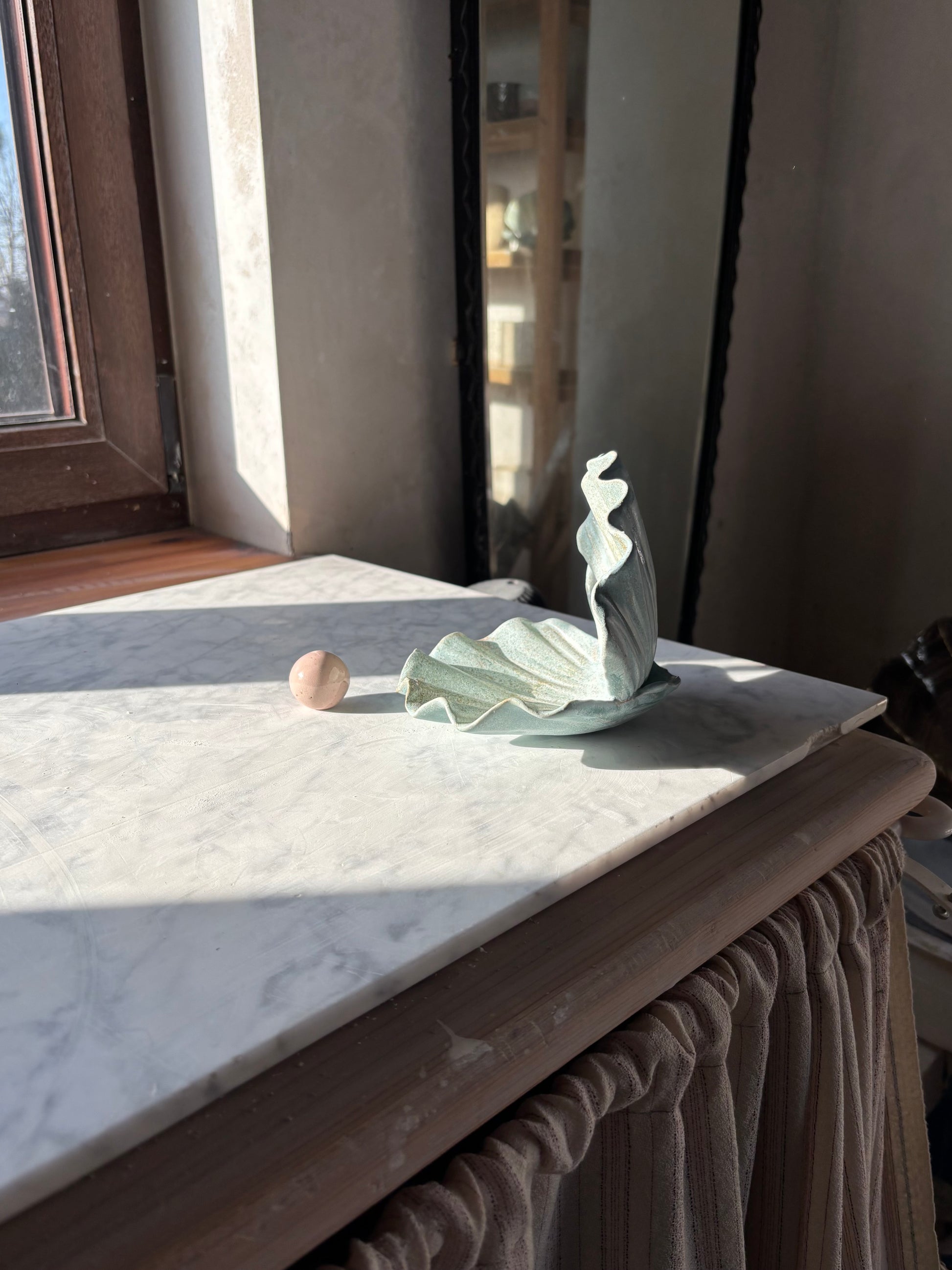 Autorska ceramiczna podstawka na drobiazgi w kształcie otwartej muszli. Idealna na biżuterię, palo santo, kryształy, przekąski lub ukochane drobiazgi. Muszla jest stworzona przez Moni, założycielkę marki Maison Fragile. Każda jest lepiona i szkliwiona bez użycia form, co sprawia, że każdy egzemplarz jest unikatowy.